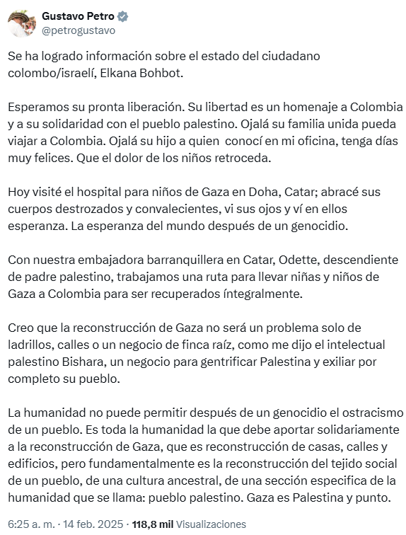 A través de su cuenta en la red social X, Petro detalló: “Se ha logrado información sobre el estado del ciudadano colombo-israelí Elkana Bohbot. Esperamos su pronta liberación. Su libertad es un homenaje a Colombia y a su solidaridad con el pueblo palestino. Ojalá su familia unida pueda viajar a Colombia. Ojalá su hijo, a quien conocí en mi oficina, tenga días muy felices. Que el dolor de los niños retroceda”.