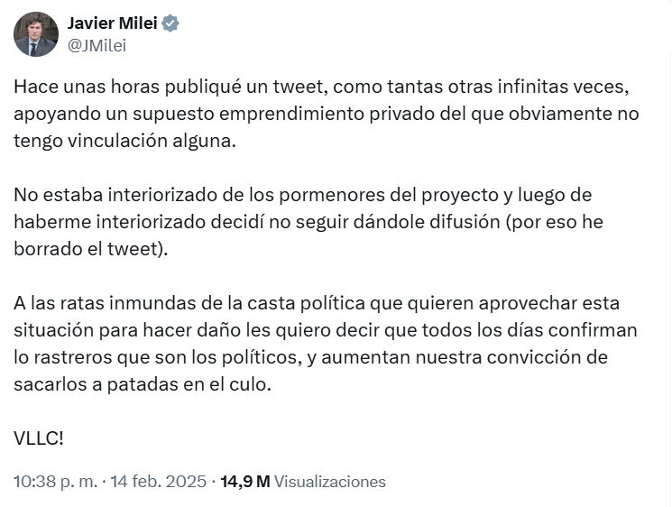 Ante la ola de críticas, Milei se vio obligado a aclarar su postura: “Hace unas horas publiqué un tuit, como tantas otras infinitas veces, apoyando un supuesto emprendimiento privado del que obviamente no tengo vinculo alguno. No estaba interiorizado de los pormenores del proyecto y luego de haberme interiorizado decidí no seguir dándole difusión (por eso he borrado el tuit)”, explicó el mandatario en X, plataforma antes conocida como Twitter.