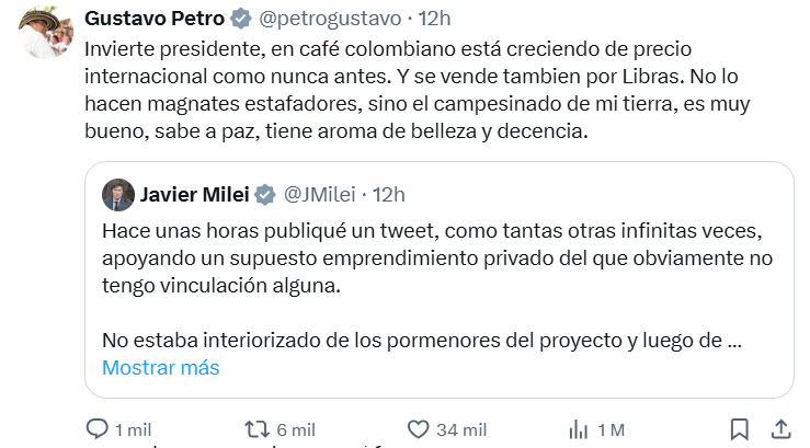 Aprovechando el incidente, Gustavo Petro lanzó una irónica respuesta que pronto se volvió tendencia. “Invierte, presidente, el café colombiano está creciendo de precio internacional como nunca antes. Y se vende también por libras. No lo hacen magnates estafadores, sino el campesinado de mi tierra; es muy bueno, sabe a paz, tiene aroma de belleza y decencia”, escribió Petro en su cuenta de X, jugando con el nombre de la criptomoneda y resaltando los valores del campo colombiano.