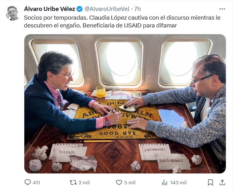 El ataque de Uribe comenzó con un mensaje en X. Publicó una imagen manipulada que mostraba a López y Petro frente a una tabla ouija, sugiriendo una alianza oportunista. Aseguró que la exalcaldesa «cautiva con el discurso mientras le descubren el engaño», y la señaló como beneficiaria de USAID para difamar a sus adversarios políticos.