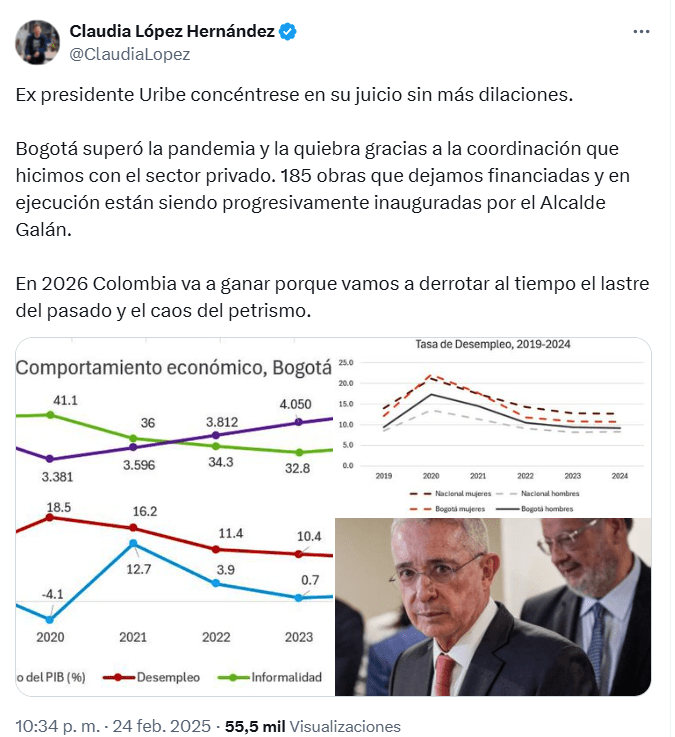 El cruce entre ambos líderes ocurre en un momento de creciente polarización. Uribe, pese a su juicio, mantiene una influencia clave en el Centro Democrático, mientras López se perfila como posible candidata presidencial para 2026, tras su paso por la Alcaldía y el Senado.