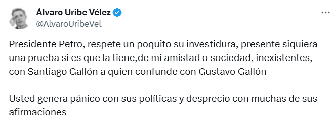 Uribe no tardó en contestar. «Respete un poquito su investidura», escribió en su cuenta de X, pidiéndole al presidente que presente «siquiera una prueba» de esa supuesta amistad o sociedad, que calificó de inexistente. Aclaró que Petro confunde a Santiago Gallón con Gustavo Gallón, y cuestionó la gestión del mandatario. «Usted genera pánico con sus políticas y desprecio con muchas de sus afirmaciones», agregó.