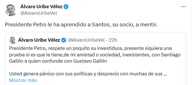 El exmandatario fue más allá una hora después. En un segundo mensaje, acusó a Petro de mentir y lo comparó con el expresidente Juan Manuel Santos. «Le ha aprendido a Santos, su socio, a mentir», señaló, intensificando el cruce verbal. Uribe también vinculó las acusaciones a su actual proceso judicial por presunto soborno y fraude procesal, sugiriendo que el gobierno busca «criminalizarlo» para mantenerse políticamente a flote.