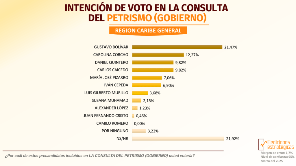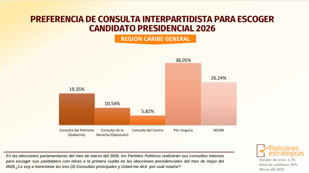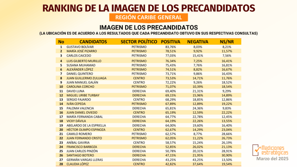 La «Primera Parte de la Gran Encuesta del Caribe 2025«, publicada este 6 de marzo por Mediciones Estratégicas S.A.S., ofrece un análisis detallado sobre las tendencias políticas en la Región Caribe de Colombia, con miras a las consultas interpartidistas de marzo de 2026, que definirán los candidatos presidenciales para las elecciones de mayo.