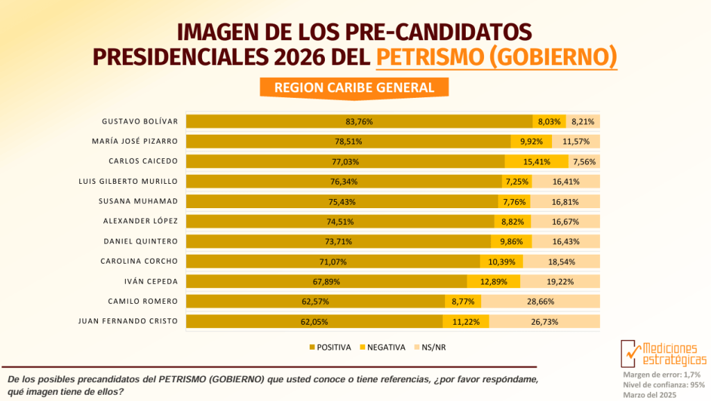 Este menor nivel de reconocimiento puede explicarse por su rol como canciller, una posición enfocada en política exterior y con menos presencia mediática en el Caribe, en comparación con exsenadores o exalcaldes. Sin embargo, su alta favorabilidad entre quienes lo conocen indica que su trayectoria genera confianza y que su perfil podría fortalecerse con mayor visibilidad.