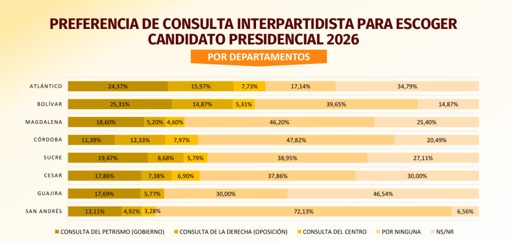 El progresismo mantiene su dominio en Atlántico (24,37%) y Bolívar (25,31%), dos de las regiones urbanas más importantes del Caribe. Sin embargo, enfrenta una caída en Córdoba (11,39%) y San Andrés (13,11%), donde el rechazo a las consultas interpartidistas llega al 72,13%.