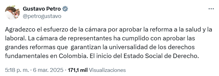 El presidente de la Cámara, Jaime Raúl Salamanca, confirmó la aprobación de 83 artículos, de los cuales 11 se mantuvieron como estaban en la ponencia y 51 fueron modificados en plenaria. “La Cámara ha cumplido con garantizar la universalidad de los derechos fundamentales”, celebró Petro en X. El ministro del Interior, Armando Benedetti, destacó que la reforma asegura “un cuidado integral, transparencia en los recursos y el fin del paseo de la muerte”.