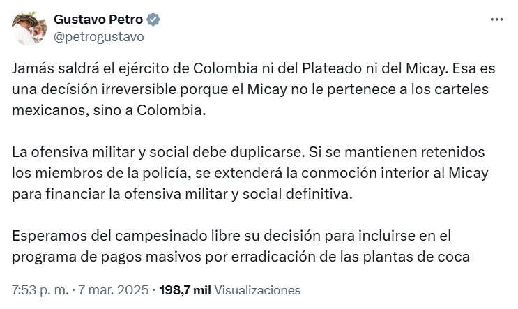 El presidente Gustavo Petro anunció este viernes una ofensiva militar reforzada en El Plateado y el cañón del Micay, en el Cauca, tras el secuestro de 28 policías y un mayor del Ejército por parte de campesinos el jueves 6 de marzo en la zona rural de Argelia. El conflicto, impulsado por disidencias de las Farc que buscan controlar el territorio, ha intensificado la violencia en una región marcada por economías ilícitas y disputas con la Fuerza Pública. A través de su cuenta en X, Petro afirmó: “Jamás saldrá el ejército de Colombia ni del Plateado ni del Micay. Esa es una decisión irreversible porque el Micay no le pertenece a los carteles mexicanos, sino a Colombia”.