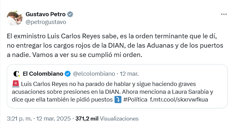 El presidente Gustavo Petro salió este miércoles en defensa de la canciller Laura Sarabia, luego de que el exministro de Comercio, Luis Carlos Reyes, la señalara por presuntas solicitudes de nombramientos en la Dirección de Impuestos y Aduanas Nacionales (DIAN). En una publicación en su cuenta de X, Petro afirmó: “El exministro Luis Carlos Reyes sabe, es la orden terminante que le di: no entregar los cargos rojos de la DIAN, de las Aduanas y de los puertos a nadie. Vamos a ver si se cumplió mi orden”, dejando entrever que evaluará si Reyes acató su directriz de evitar presiones en los nombramientos.