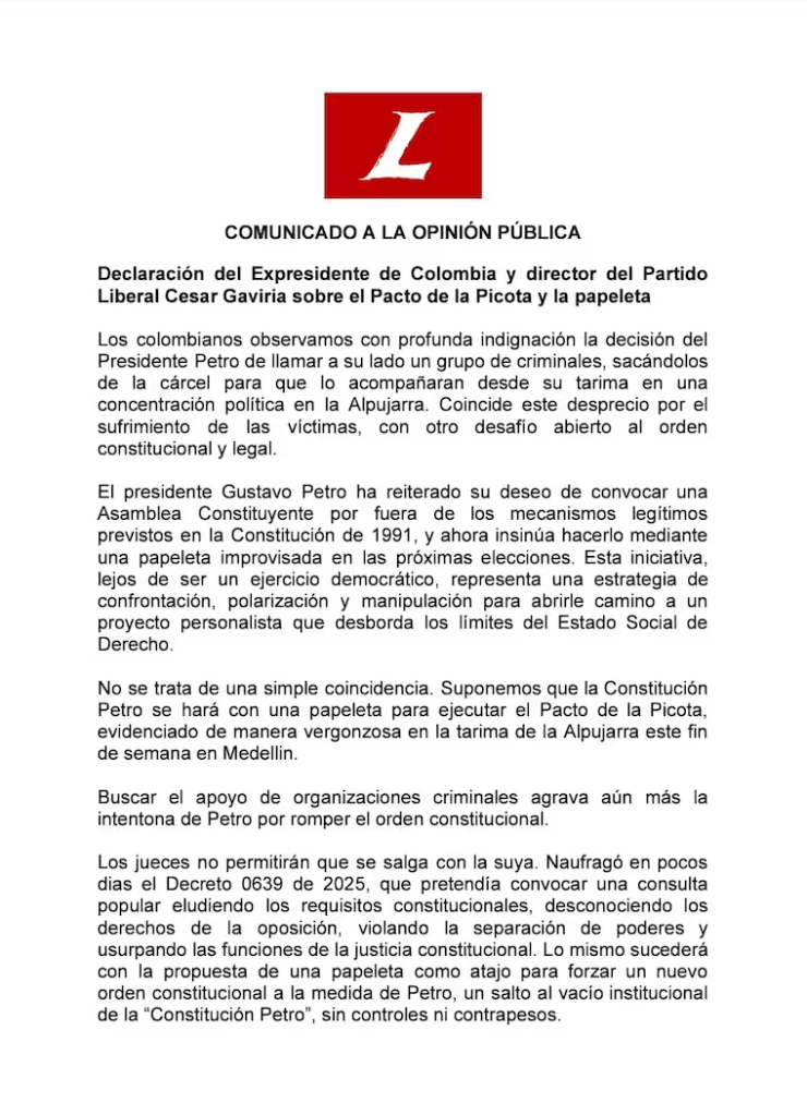 En un comunicado, Gaviria calificó como un “desafío al orden constitucional y legal” la aparición de cabecillas condenados por delitos como homicidio y narcotráfico en una tarima junto al jefe de Estado. Señaló que la presencia de estas figuras, traídas desde centros penitenciarios, representa un mensaje preocupante para las víctimas y la institucionalidad.