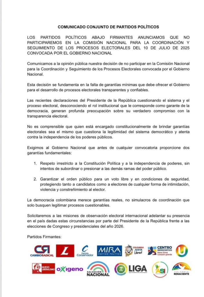 En una carta conjunta, los partidos Liberal, Conservador, Cambio Radical, Centro Democrático, La U, Mira, Colombia Justa Libres, Nuevo Liberalismo, Verde Oxígeno, Salvación Nacional, Liga de Gobernantes Anticorrupción, ASI y Colombia Renaciente afirmaron que no participarán del encuentro debido a lo que califican como “un ambiente de incertidumbre creado desde el mismo Ejecutivo”.
