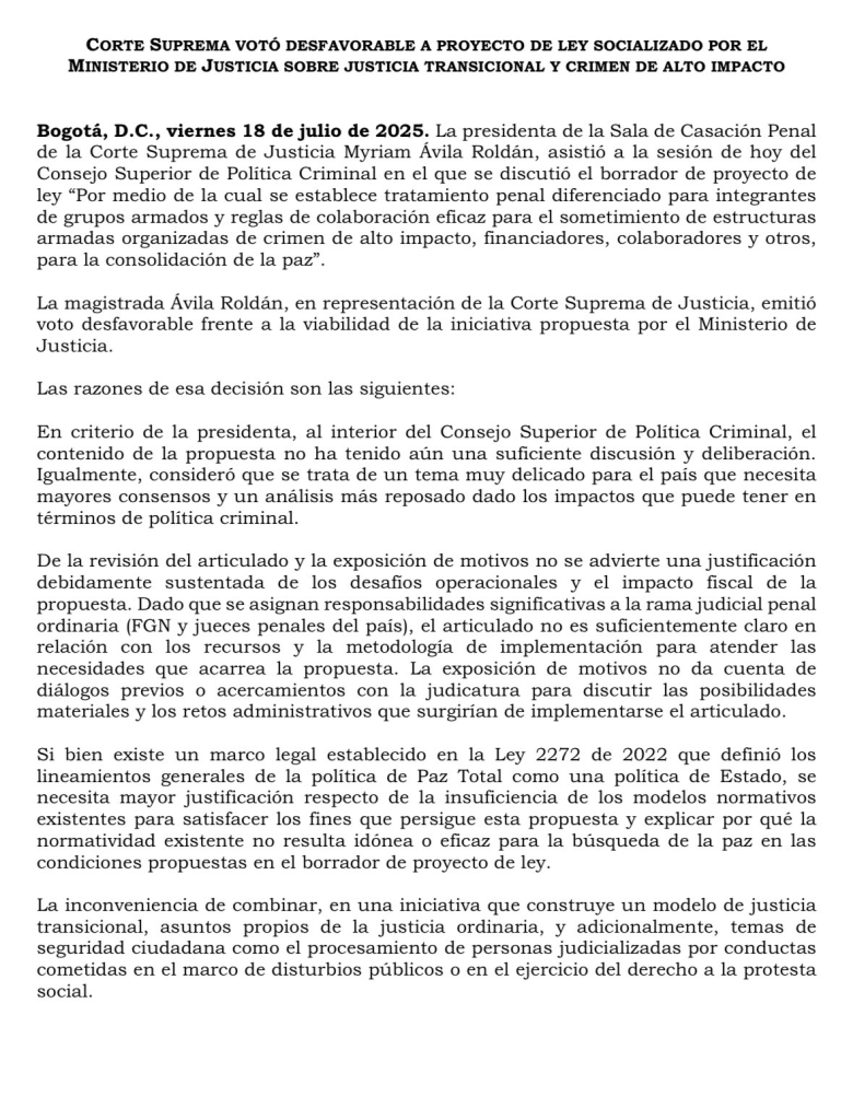 La Corte Suprema de Justicia, a través de su Sala de Casación Penal, votó en contra del borrador del proyecto de ley presentado por el Ministerio de Justicia como parte de la política de “Paz Total” del Gobierno Petro. El texto, que propone un tratamiento penal diferenciado para miembros de grupos armados ilegales y estructuras criminales, no convenció al alto tribunal, que señaló graves deficiencias en su elaboración y falta de concertación con la rama judicial.