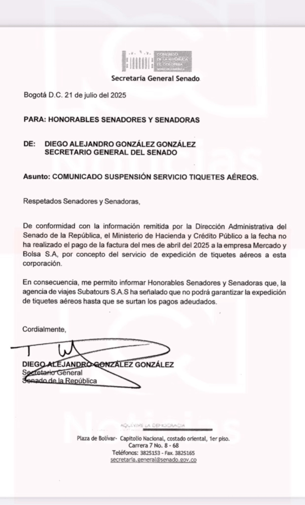La Secretaría General del Senado informó este 21 de julio que los tiquetes aéreos para congresistas fueron suspendidos por incumplimientos del Ministerio de Hacienda con la empresa proveedora del servicio. La medida generó alarma entre los legisladores, que dependen de estos desplazamientos para asistir a las sesiones en Bogotá.