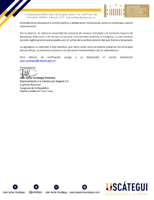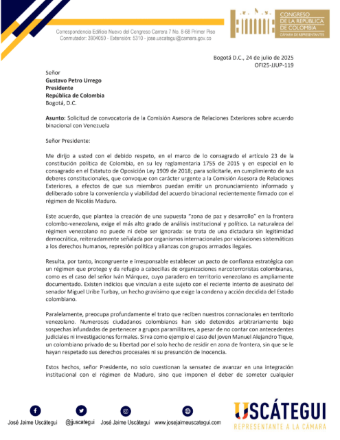 El representante a la Cámara José Jaime Uscátegui, del Centro Democrático, solicitó al presidente Gustavo Petro la convocatoria urgente de la Comisión Asesora de Relaciones Exteriores para analizar el acuerdo binacional firmado con Venezuela, que busca crear una “zona de paz y desarrollo” en la frontera común.