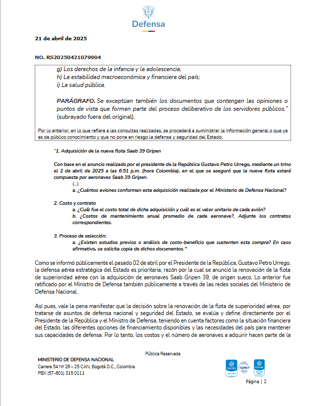 La denuncia surge tras la respuesta de un derecho de petición elevado por Arbeláez al Ministerio de Defensa, en la que se reconoció que, amparados en la Ley de Transparencia y el artículo 19 de la Ley 1712 de 2014, no se han revelado detalles sobre la cantidad de aeronaves, costos totales de adquisición ni cifras de mantenimiento. La congresista advirtió que no hay estudios de costo-beneficio ni un presupuesto aprobado para operar los Gripen, lo que implicaría sobrecostos y comprometería recursos de futuras vigencias.