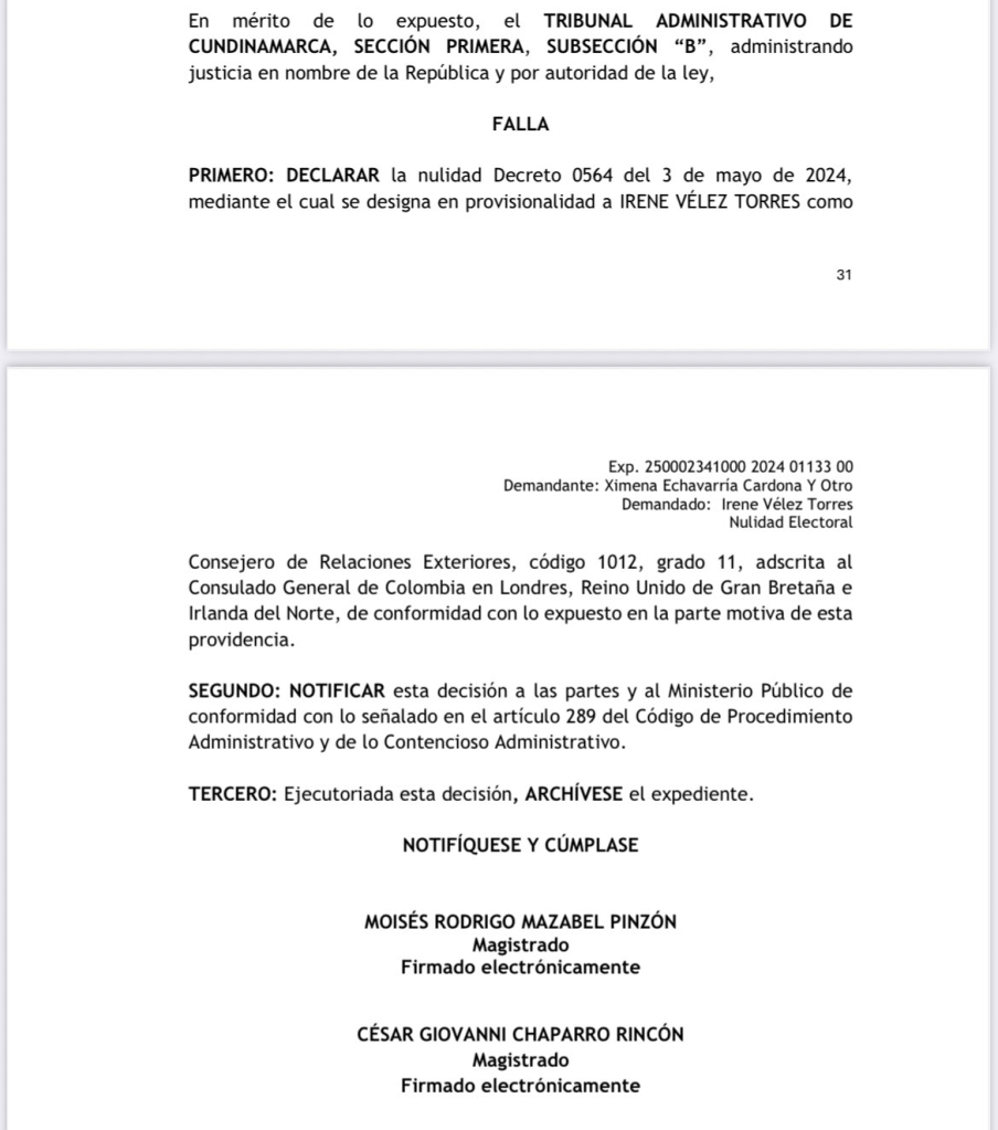 El Tribunal Administrativo de Cundinamarca declaró nulo el nombramiento de Irene Vélez como consejera en el Consulado de Colombia en Londres, al concluir que el Gobierno hizo un uso indebido de la figura de la provisionalidad para su designación.