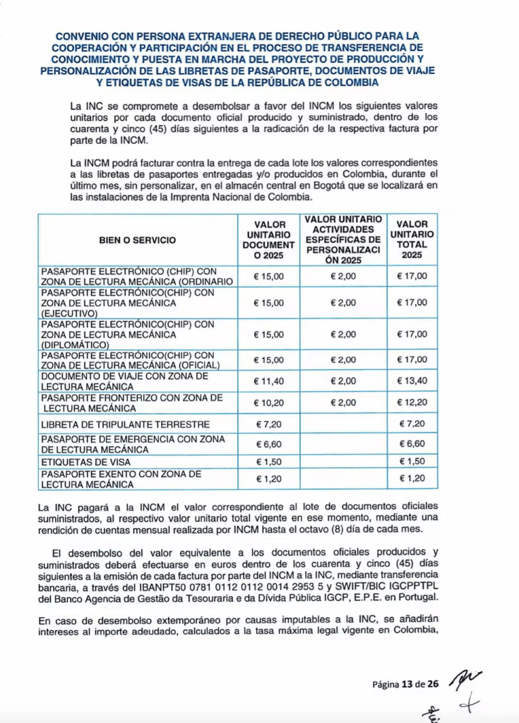 El esquema de pagos se ajusta en euros: cada pasaporte tendrá un costo fijo de 17 euros, aunque el convenio deja abierta la posibilidad de revisión si la Tasa Representativa del Mercado Euro/COP varía más de un 10 % en un año.