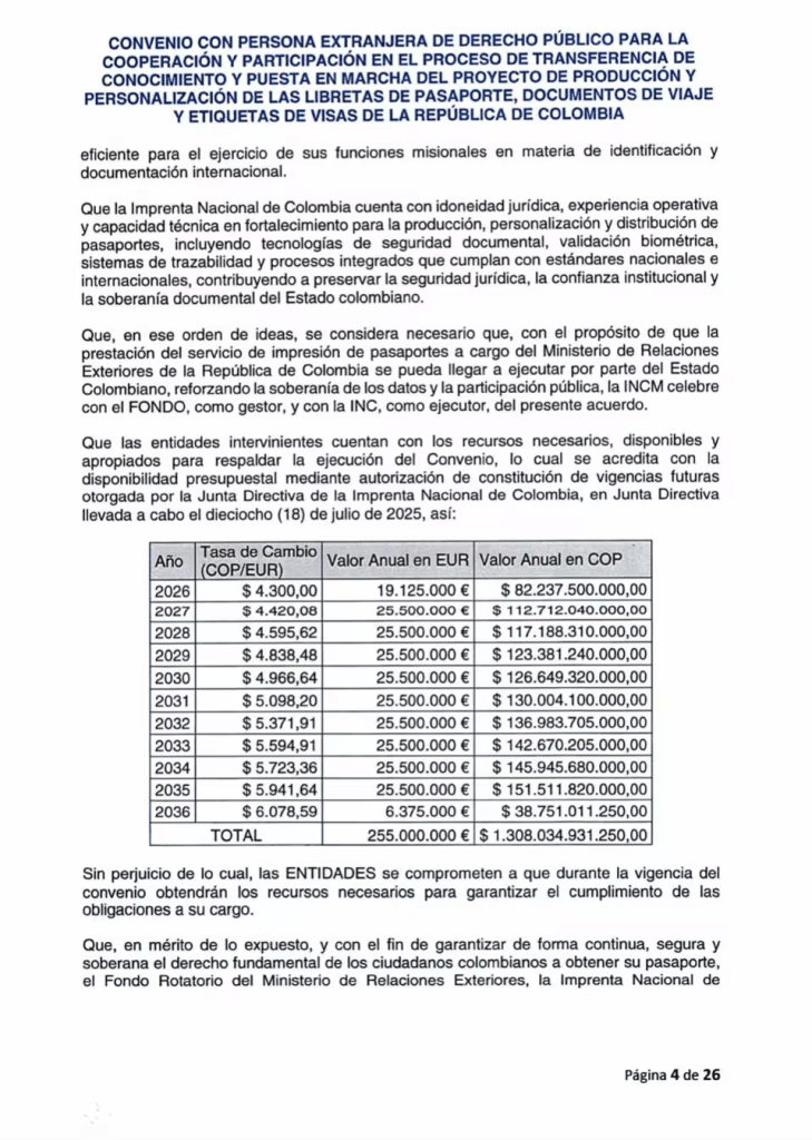 Quedó en firme el convenio entre el Gobierno de Colombia y la Casa de la Moneda de Portugal para la elaboración de los pasaportes nacionales a partir del 1.° de abril de 2026. El contrato asciende a 255 millones de euros, es decir, más de 1,3 billones de pesos, y tendrá una duración de diez años, hasta 2036.