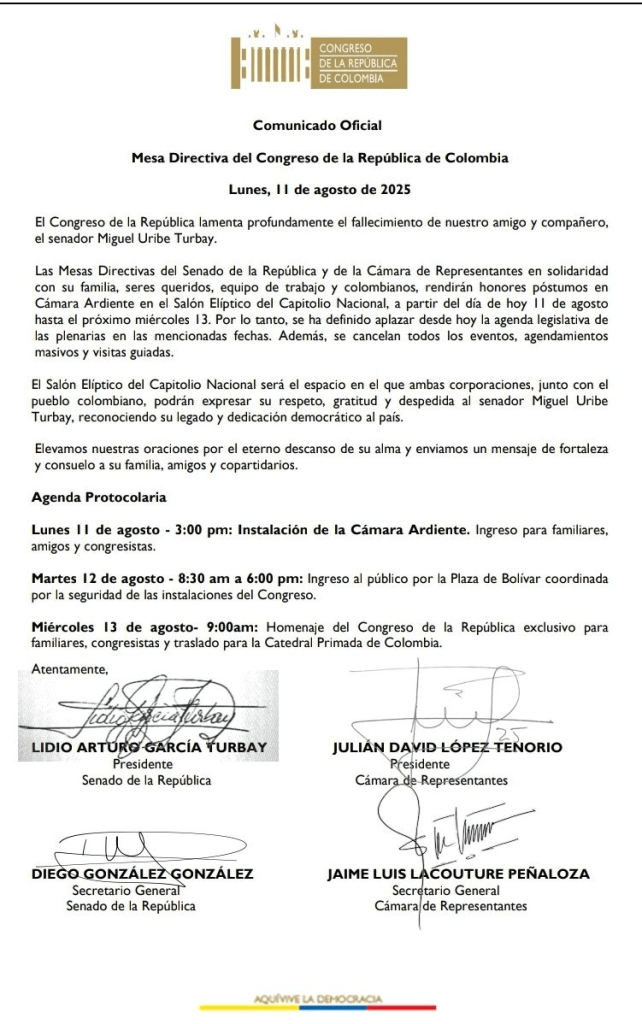 En declaraciones a La FM, García confirmó que el cuerpo de Uribe será velado en cámara ardiente en el Salón Elíptico del Capitolio Nacional desde este lunes a las 3:00 p.m., con la presencia de protocolos de seguridad que permitirán a la ciudadanía despedirse del legislador. “El Congreso abrirá sus puertas para que Colombia pueda despedirlo sin problema. El cuerpo llega hoy a las 3:00 de la tarde y la misa se realizará el miércoles en la Catedral Primada, desde donde saldrá el cortejo fúnebre”, indicó.
