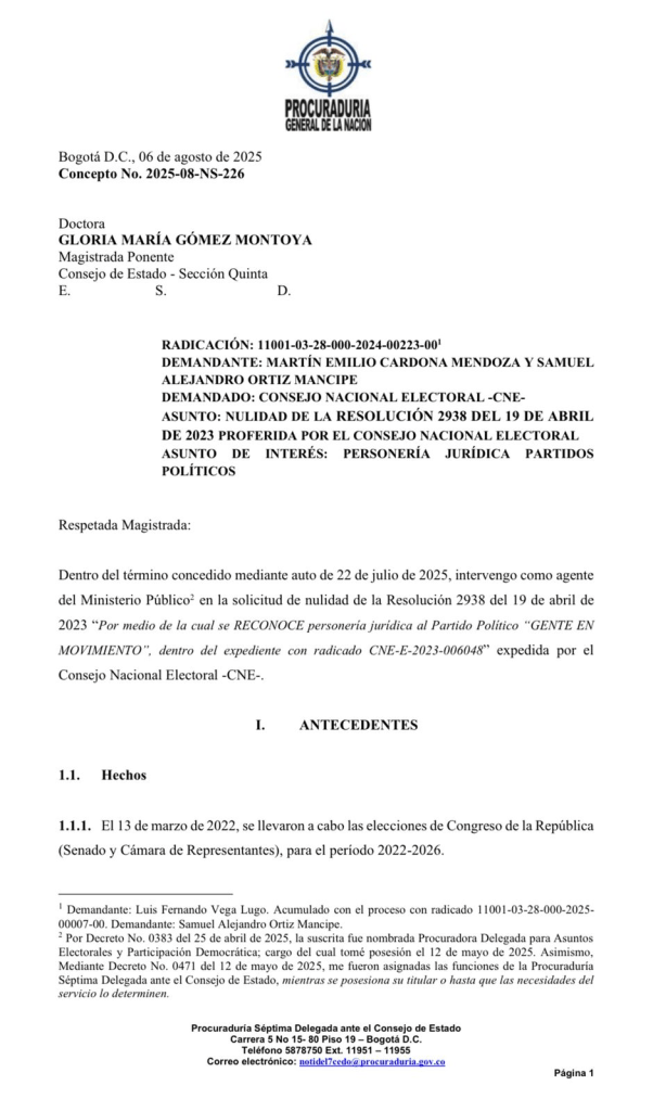 La Procuraduría General de la Nación solicitó ante la Sección Quinta del Consejo de Estado la anulación de la resolución del Consejo Nacional Electoral (CNE) que otorgó la personería jurídica al partido Gente en Movimiento, liderado por el precandidato presidencial y exministro de Tecnologías de la Información Mauricio Lizcano.