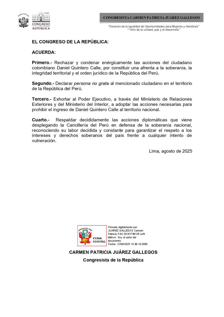 La congresista Patricia Juárez, autora de la iniciativa, calificó el acto como una “afrenta a la soberanía” y señaló que la medida no busca hostigar al pueblo colombiano, sino dejar claro que la soberanía peruana “no se discute, no se negocia y no se utiliza como accesorio de campaña”. La moción exhorta al Poder Ejecutivo, a través de los ministerios de Relaciones Exteriores y del Interior, a impedir el ingreso de Quintero al territorio peruano.
