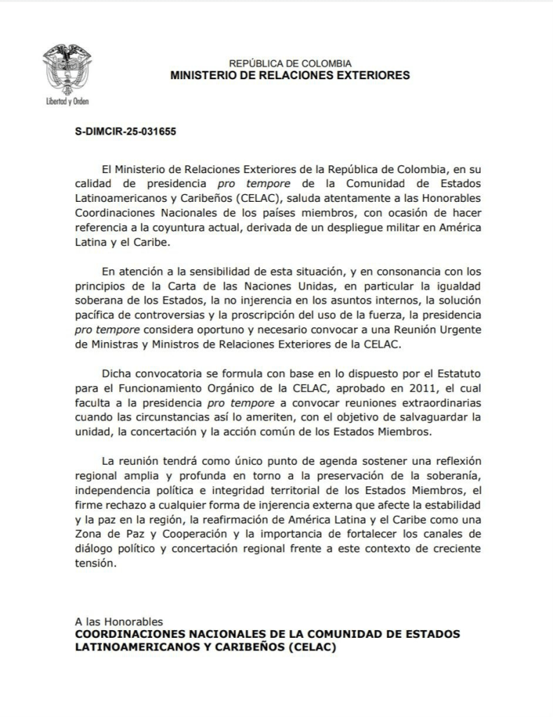 La Cancillería informó este domingo que Colombia citó a una reunión extraordinaria de la Comunidad de Estados Latinoamericanos y Caribeños (CELAC), programada para las 10 de la mañana de este lunes, con el fin de abordar la tensión regional tras el despliegue de tropas y buques militares de Estados Unidos en aguas del Caribe.