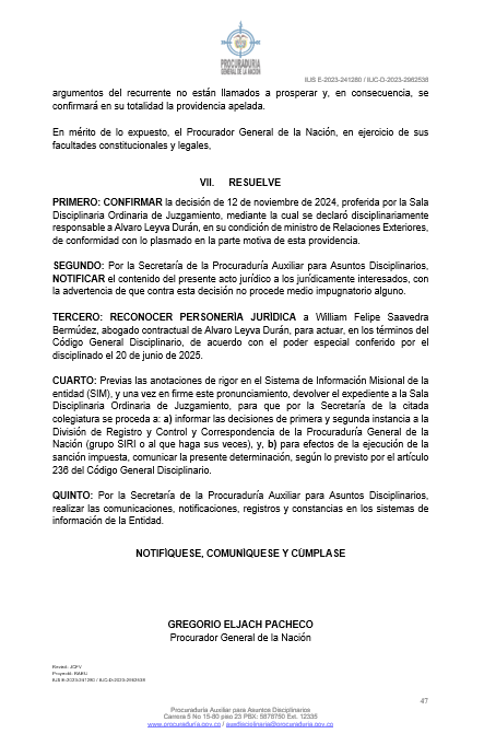 Con la confirmación en segunda instancia, la sanción adquiere carácter definitivo y se convierte en un precedente disciplinario relevante. Leyva, quien había sido una de las figuras políticas más visibles del actual gobierno en temas de paz y relaciones exteriores, queda inhabilitado para ejercer funciones públicas por una década.