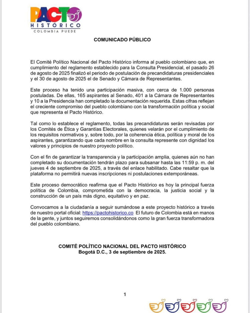 El Pacto Histórico oficializó el cierre de inscripciones para sus precandidaturas a la Presidencia, Senado y Cámara de Representantes de cara a las elecciones de 2026. En total, el proceso reunió a más de mil interesados, de los cuales diez buscan la Casa de Nariño, 165 el Senado y 401 la Cámara.