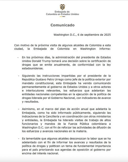 La delegación diplomática señaló en un comunicado que “es lamentable que algunos alcaldes desconozcan la labor que se ha adelantado con el fin de informar los avances y resultados de la política de drogas”. Según la Embajada, bajo instrucciones del presidente Gustavo Petro, se han mantenido comunicaciones permanentes con autoridades y agencias estadounidenses, además de liderar visitas técnicas de funcionarios y de la Fuerza Pública a Washington D.C. para sustentar los resultados de la estrategia antidrogas.