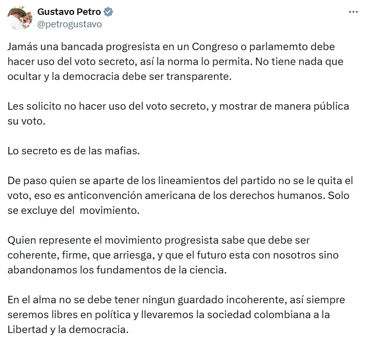 El mandatario utilizó su cuenta en X para señalar que “jamás una bancada progresista en un Congreso o parlamento debe hacer uso del voto secreto, así la norma lo permita. No tiene nada que ocultar y la democracia debe ser transparente. Les solicito no hacer uso del voto secreto, y mostrar de manera pública su voto”. Agregó que el secreto, en su opinión, “es de las mafias” y aclaró que los congresistas que se aparten de los lineamientos del movimiento no perderían el derecho al voto, sino que podrían ser excluidos del partido.