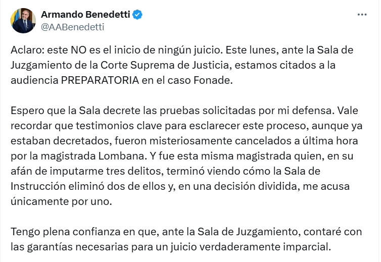 La audiencia preparatoria está programada para el lunes 15 de septiembre a las 4:30 p.m. en la Sala Penal de la Corte Suprema, donde se realizará la lectura del auto de Ley 600 de Primera Instancia. Benedetti fue notificado sobre el inicio del proceso en febrero pasado.