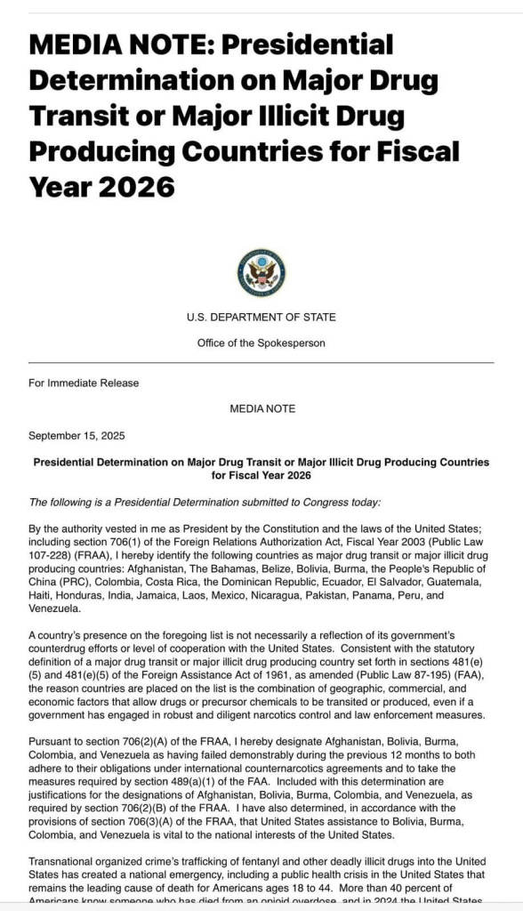 Minutos después de las declaraciones del jefe de Estado, la Casa Blanca confirmó la medida en el marco de la Estrategia Internacional de Control de Narcóticos. El gobierno estadounidense concluyó que Colombia incumplió sus compromisos internacionales en materia de reducción de cultivos ilícitos y combate al narcotráfico.
