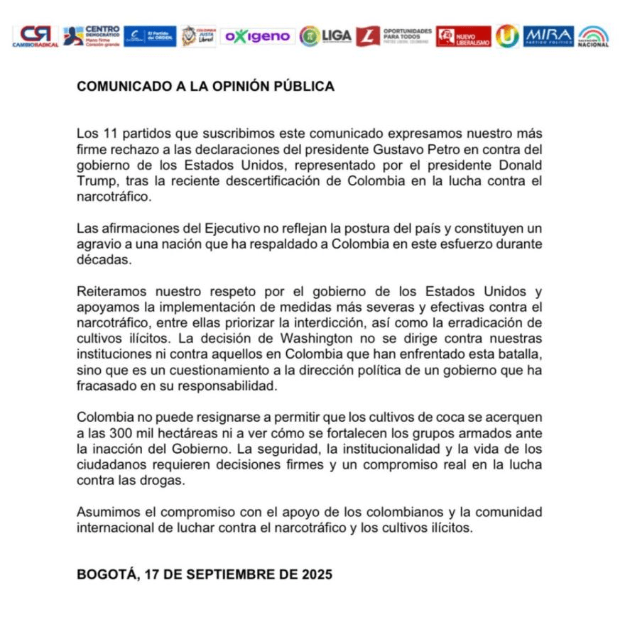 Un bloque de once partidos políticos emitió un comunicado conjunto en el que rechazó las afirmaciones del presidente Gustavo Petro hacia el Gobierno de Estados Unidos, tras la decisión de Washington de descertificar a Colombia en la lucha contra el narcotráfico.