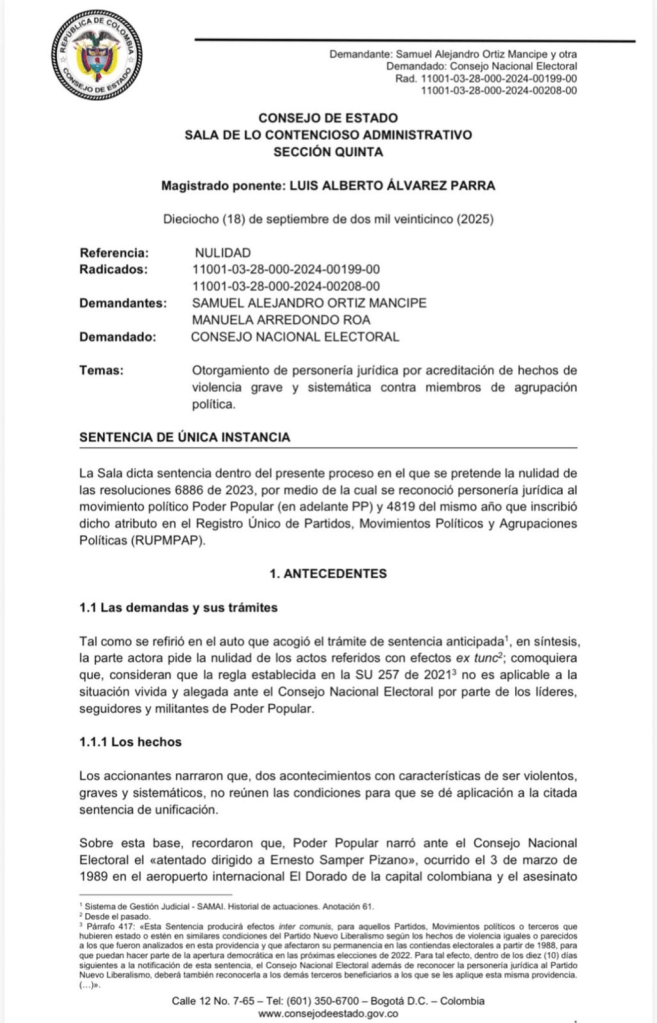 La Sección Quinta del Consejo de Estado anuló la personería jurídica del movimiento Poder Popular, liderado por el expresidente Ernesto Samper, al concluir que no hubo pruebas de violencia sistemática que impidieran su participación electoral. La decisión es definitiva y no procede ningún recurso.