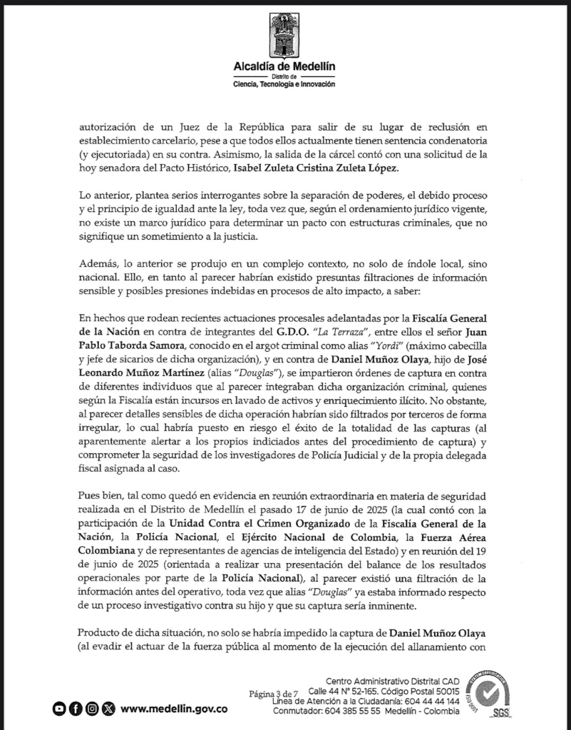 En la misiva, el alcalde también advirtió sobre supuestas filtraciones que habrían alertado a Daniel Muñoz, hijo de alias Douglas, de un operativo en su contra, lo que le permitió evadir inicialmente la captura en junio. El joven terminó entregándose a las autoridades semanas después.