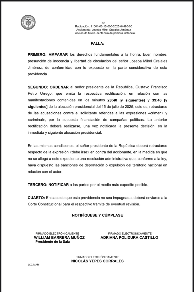 Estas afirmaciones llevaron a Grajales a interponer una acción de tutela argumentando que el presidente había lesionado su reputación y lo había expuesto a una “condena social” sin que existiera una investigación penal o una sentencia judicial en su contra.
