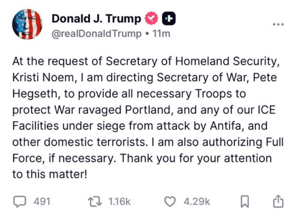 “He dado instrucciones al secretario de Guerra, Pete Hegseth, para que proporcione todas las tropas necesarias para proteger a Portland, devastada por la guerra”, escribió Trump en su red social Truth Social.