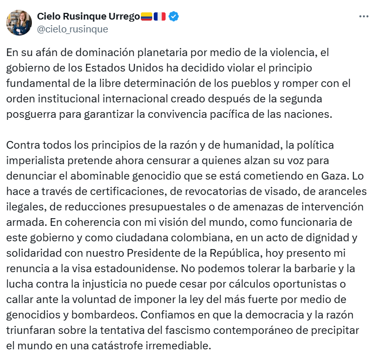 Poco después, la canciller Rosa Villavicencio anunció que renunciaba voluntariamente a su visa estadounidense como muestra de respaldo al mandatario. “Como ministra de Relaciones Exteriores he decidido renunciar al visado estadounidense. Nuestra soberanía no se arrodilla. Colombia se respeta”, afirmó en redes sociales.