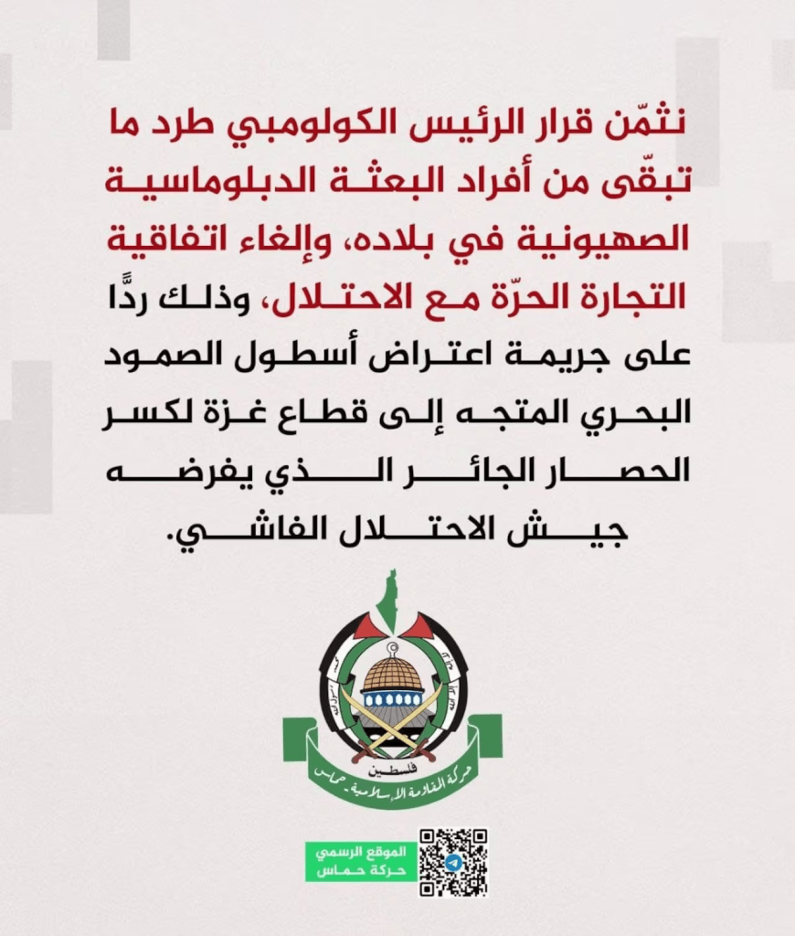 En un comunicado publicado por medios internacionales, Hamás afirmó, “Valoramos la decisión del presidente colombiano de expulsar a los restantes miembros de la misión diplomática sionista en su país y de cancelar el acuerdo de libre comercio con la ocupación, como respuesta al crimen de interceptar la flota de la resistencia marítima que se dirigía a Gaza para romper el injusto bloqueo impuesto por el ejército de ocupación”.