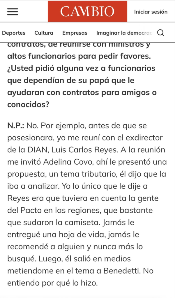 La afirmación surge tras la entrevista publicada por Cambio, en la que Nicolás Petro negó haber gestionado puestos o entregado documentos para nombramientos en el Gobierno. Reyes, en respuesta, aseguró que ese encuentro sí existió y que dejó constancia ante las autoridades desde 2023.