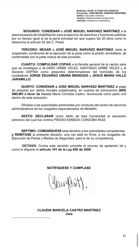 La decisión fue adoptada por la jueza Claudia Marcela Castro, quien también condenó a 28 años de prisión al exsubdirector del Departamento Administrativo de Seguridad (DAS), José Miguel Narváez Martínez, por el secuestro de la senadora Piedad Córdoba.