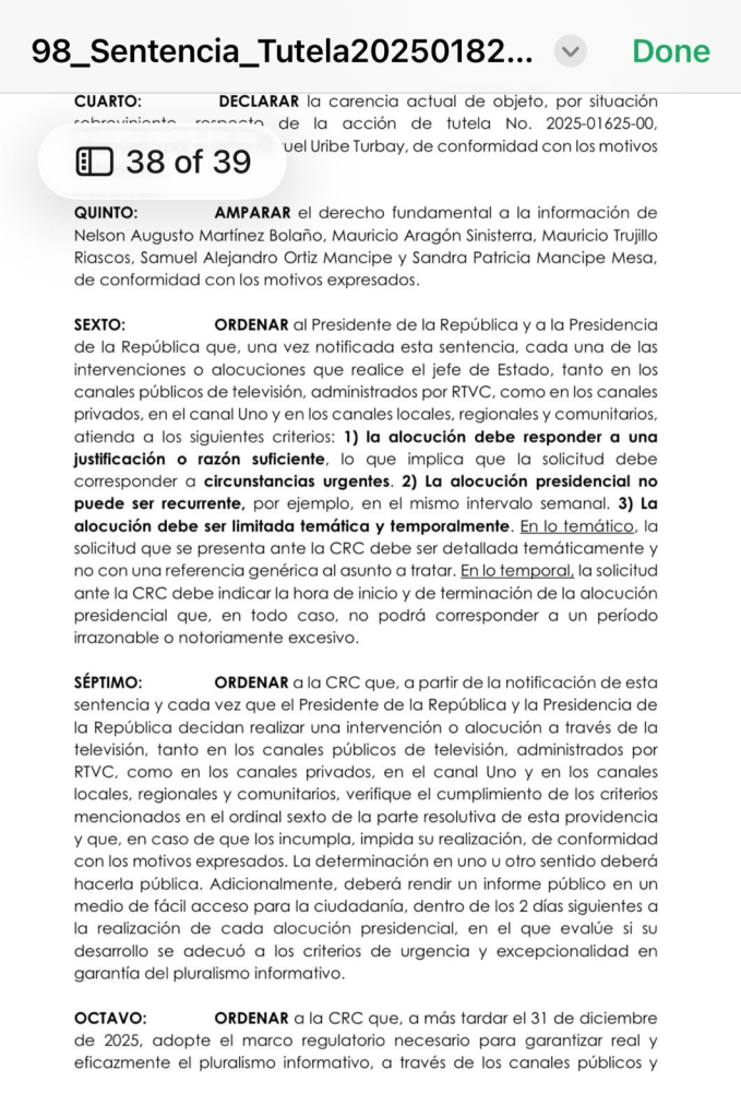 La Sección Tercera del Consejo de Estado falló que la Presidencia de la República, bajo el gobierno de Gustavo Petro, vulneró el derecho a la información al abusar de las alocuciones presidenciales transmitidas por canales públicos y privados. Según el tribunal, la frecuencia, duración y reiteración de estas intervenciones impedían que los ciudadanos escogieran libremente los temas de su interés.