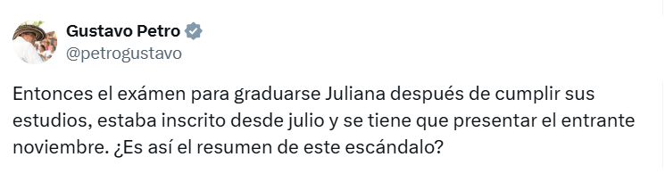 Mientras tanto, el presidente Gustavo Petro reaccionó públicamente a la controversia con un mensaje en redes sociales en el que sugirió que el examen de Guerrero estaba programado para noviembre, “Entonces el examen para graduarse Juliana después de cumplir sus estudios estaba inscrito desde julio y se tiene que presentar el entrante noviembre. ¿Es así el resumen de este escándalo?”.