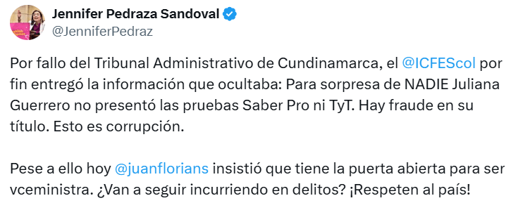 La congresista Jennifer Pedraza calificó el hecho como “un fraude” y “un acto de corrupción”, asegurando que la entrega del título sin cumplir con los requisitos legales constituye un delito. “Por fallo del Tribunal Administrativo de Cundinamarca, el @ICFEScol por fin entregó la información que ocultaba: para sorpresa de nadie, Juliana Guerrero no presentó las pruebas Saber Pro ni TyT. Hay fraude en su título. Esto es corrupción”, escribió en X.