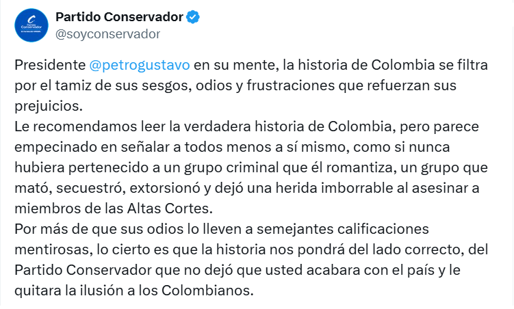 La respuesta del Partido Conservador no se hizo esperar. En un comunicado publicado en X la colectividad calificó las palabras de Petro como una versión sesgada de la historia y lo instó a “leer la verdadera historia de Colombia”. El partido acusó al presidente de proyectar “odios y frustraciones” y sostuvo que la historia pondrá al conservatismo “del lado correcto”.