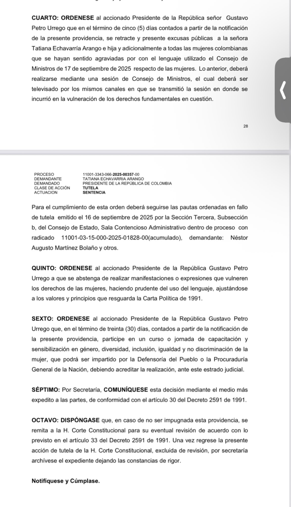 Como parte de la orden judicial, Petro tendrá cinco días hábiles para ofrecer una retractación pública durante una nueva sesión del Consejo de Ministros, transmitida por los mismos canales oficiales que difundieron sus declaraciones. Además, deberá participar en un curso o jornada de sensibilización en género, inclusión e igualdad, que podrá realizar en la Defensoría del Pueblo o en la Procuraduría General de la Nación.