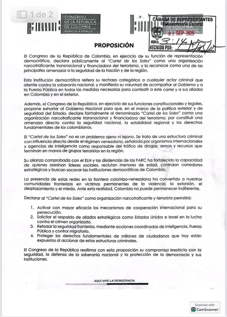 La Cámara de Representantes aprobó, con 76 votos a favor y 21 en contra, una proposición que insta al presidente Gustavo Petro a declarar al Cartel de los Soles como una organización narcotraficante y terrorista de carácter transnacional.