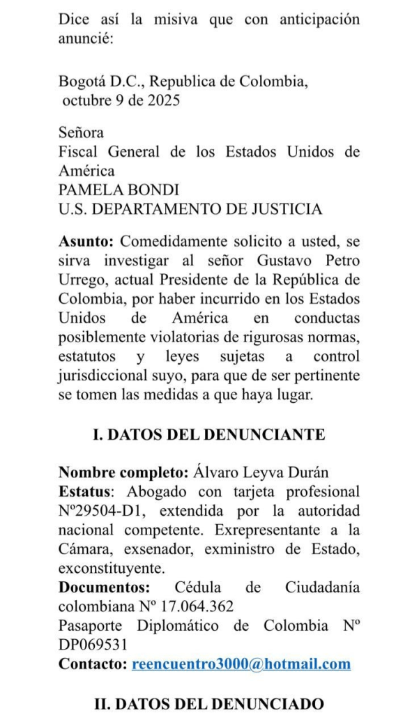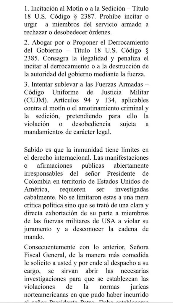 “Solicito respetuosamente se sirva investigar al señor Gustavo Petro Urrego, actual presidente de la República de Colombia, por haber incurrido en los Estados Unidos de América en conductas posiblemente violatorias de rigurosas normas y leyes federales”, expresa el documento.