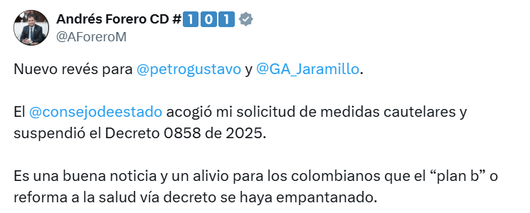 La acción fue presentada por el representante del Centro Democrático, Andrés Forero, quien celebró la medida judicial. «El presidente Petro y el ministro Jaramillo acaban de sufrir un durísimo revés. El Consejo de Estado suspendió provisionalmente el decreto 0858, que en la práctica era la implementación por la puerta de atrás de la reforma a la salud. Es una gran noticia para el país y seguiremos defendiendo el sistema de los abusos del Gobierno”, señaló el congresista.