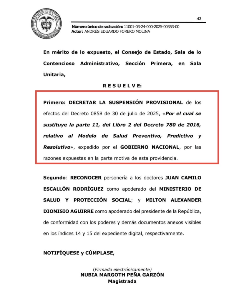 El Consejo de Estado ordenó la suspensión provisional del decreto 0858 de 2025, expedido por el Ministerio de Salud, con el cual el Gobierno Nacional pretendía poner en marcha —por vía administrativa— el modelo preventivo, predictivo y resolutivo contemplado en la reforma a la salud que aún se tramita en el Congreso. La decisión representa un nuevo revés jurídico para el Ejecutivo, que había intentado avanzar en la implementación de su reforma pese a la falta de aprobación legislativa.